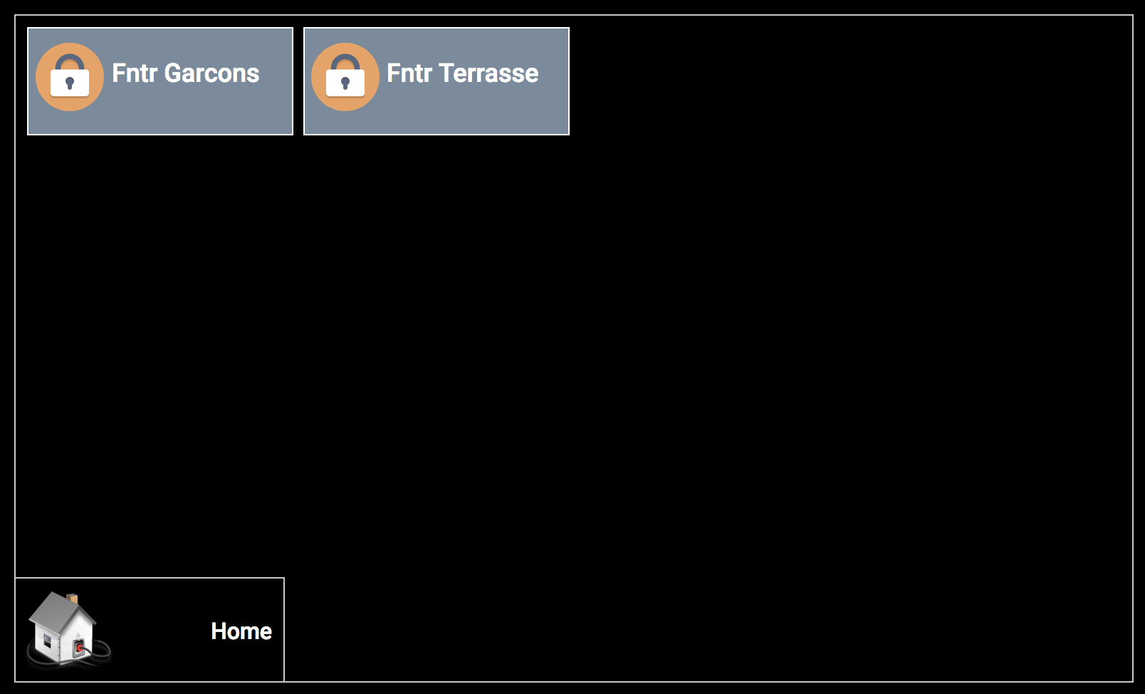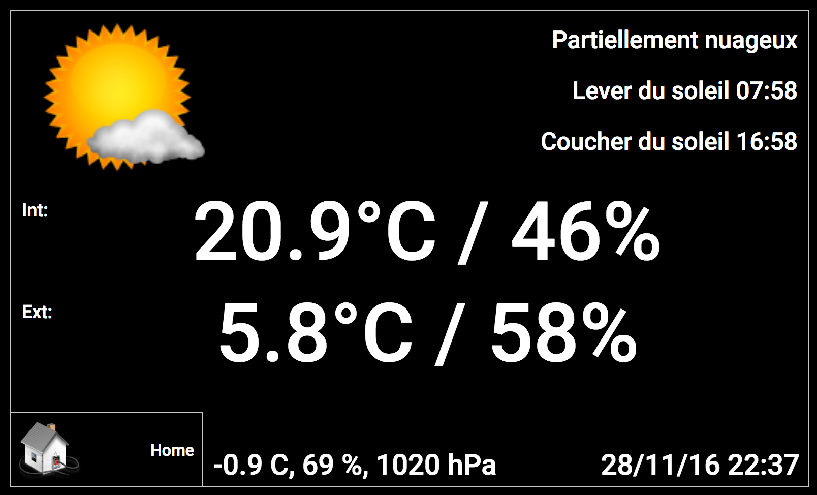 L'écran d'accueil récupère des informations du device météo (DarkSky (Weather Lookup)) et de mes capteurs de températures un peu de partout dans la maison pour afficher les moyennes de température et d'humidité internes et externes.
