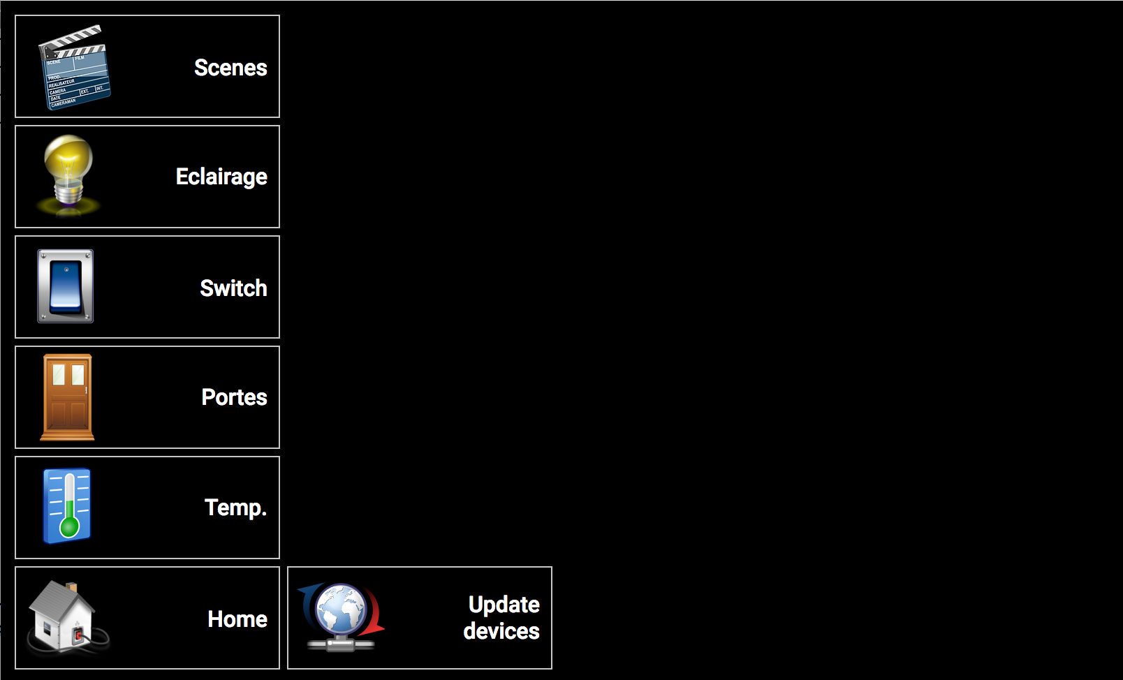 On accède au menus de commande par le menu 'home', le menu 'Update devices' permet d'initialiser la base de données et de récupérer les devices du serveur domoticz pour initialiser la base de données et en cas d'ajout de nouveaux dispositif domotique.