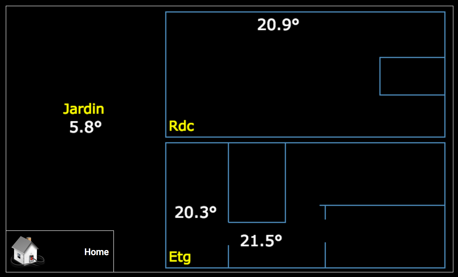 Une autre façon de visualiser les températures avec un plan schématique de ma maison et les températures disposés à l'emplacement des capteurs.